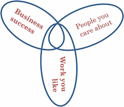 If all three of these main factors here pull you away from the others, you live in a sad world. In that case, time with people you care about takes you away from business. And work you like makes you less successful. The underlying world view is full of hard roads, long work weeks, managing by criticizing and threats, racing rats racing, and climbing corporate ladders. In this world, nice guys finish last.